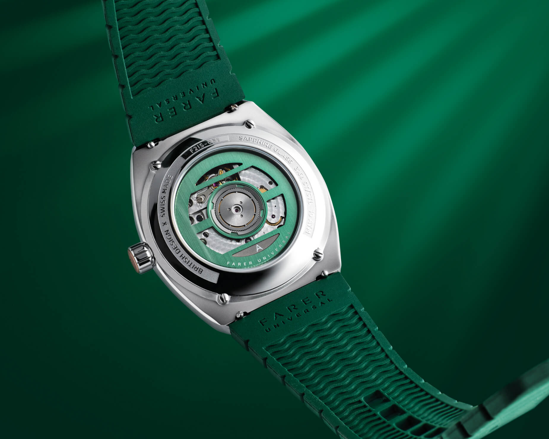 All four dials are segmented with etched horizontal lines that echo the bracelet links, creating a track pattern that flows around the entire watch. Each dial features a mix of applied batons and Arabic numerals, with three of the models using polished silver markers, whilst the Perlarum features ones made from Lumicast with black overprint that has become a Farer signature. The resultant “backglow” effect when the markers illuminate in darkness is a sight to behold.