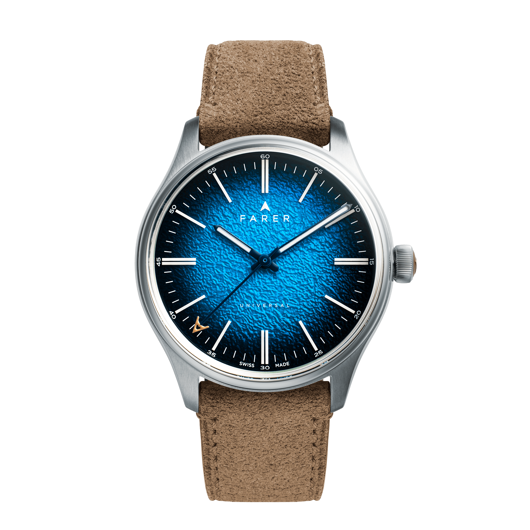 The Venture blends metallic blues and a soft, crackled texture to create a watch that’s filled with intricate details. To achieve the Venture’s unique look, the dial is first pressed to give it its texture, then it is painted multiple times to create a smoky colour gradient that draws the eye towards the dial’s centre. A clear lacquer is then applied to the dial and polished to a glossy finish. As a result of this time-consuming process, the hour markers appear to float over the dial. They’re made from Lumicast, a blend of ceramic and Super-LumiNova, and are among the thinnest shapes ever to utilise the material. The pencil hands are painted a gloss blue and are also filled with Grade X2 Super-LumiNova. For a final touch, the blue seconds hand features a peach-coloured Farer ‘A’.